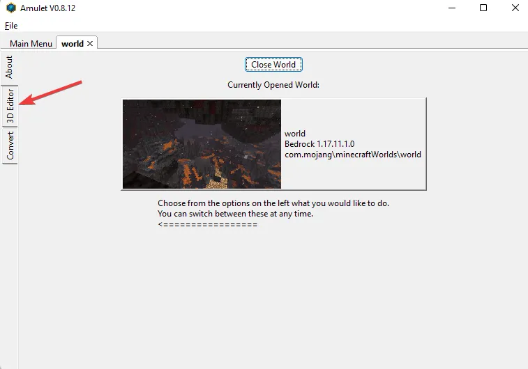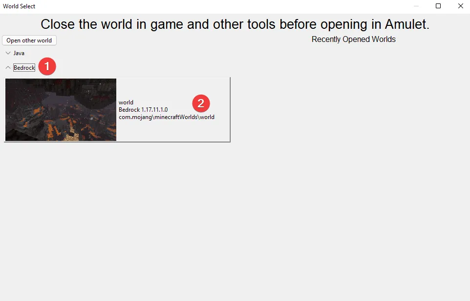 4.If you are unable to find the world, use the Open other world button in the top left to manually navigate to your saves folder.
